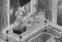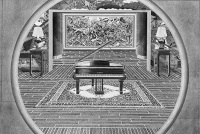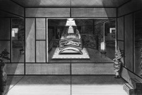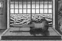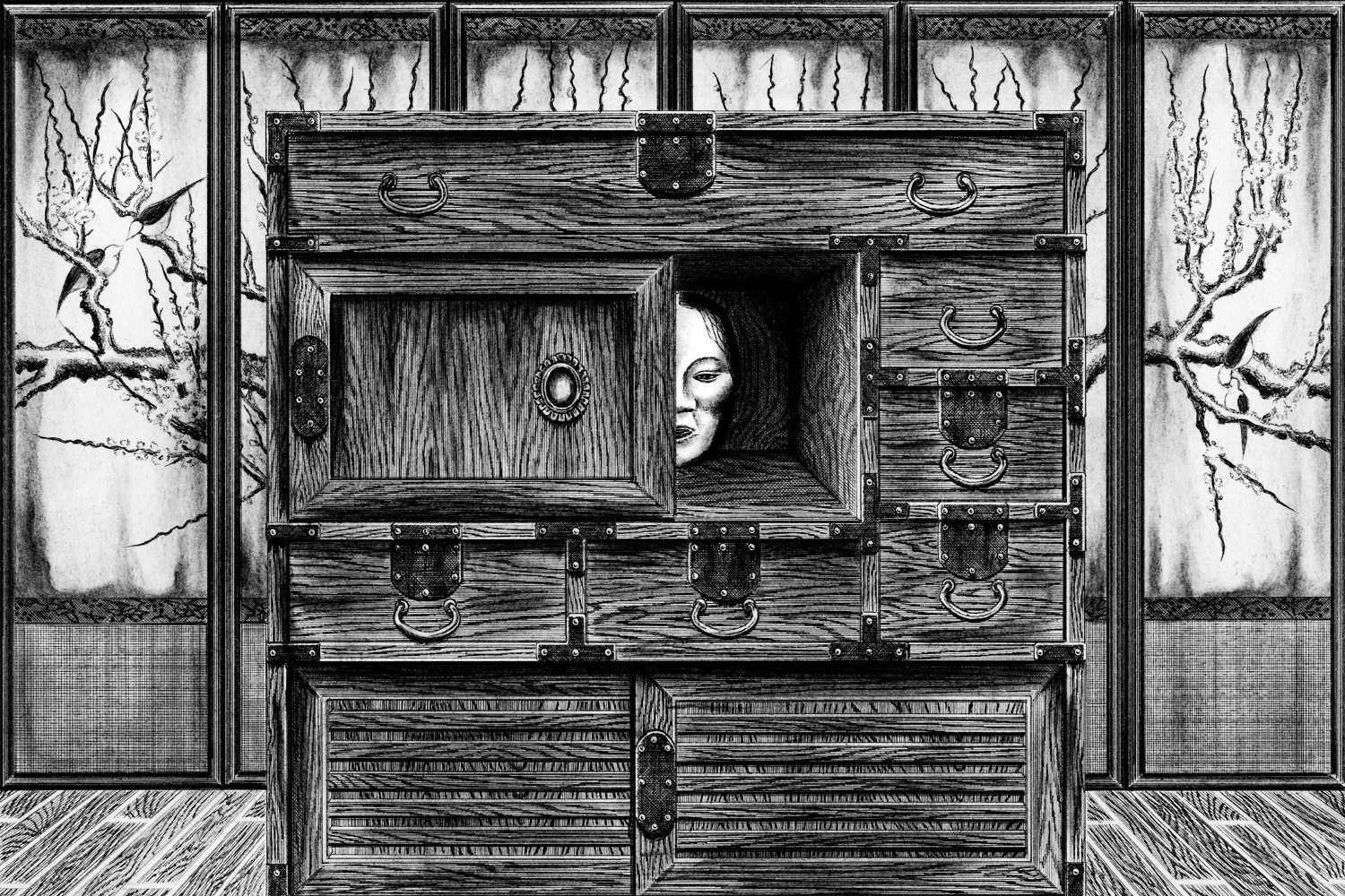 For “The House in the Trees” at Kiang Malingue, Kyung-Me further complicates the haunted anti-ruins by carefully arranging the rooms, juxtaposing Eastern and Western artefacts, relics, curios and furniture pieces from different periods. Named after respective centrepieces — The Mask, The Doll, The Bonsai, The Shrine, The Corridor, The Clocktower, The Slumber, and The Dollhouse, the painstakingly detailed rooms place a Noh Mask in a Meiji Era Tansu Storage Cabinet behind Frank Llyod Wright Sliding Doors; a Thai Buddha statue set on a Korean chest, lit by American Art Nouveau Tiffany lamps; Victorian fretwork in front of a Chinese lacquer cabinet, found in which are Ludwigsburg porcelain plates and a Russian nesting doll; a Nigerian Odudua helmet mask atop a 19th Century Edward William Godwin Octagonal Table — the radically eclectic, anachronistic drawings of excess explore horror vacui as much as claustrophobia. Re-imagining time as timelessness in isolated deterritorialised spaces, “The House in the Trees” testifies to an ever-vigilant gravity that at once pulls, grounds, spurns and deserts.