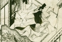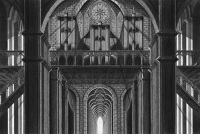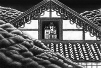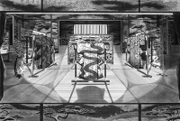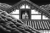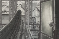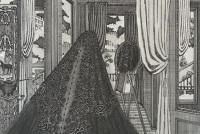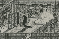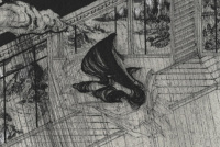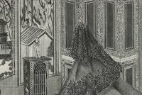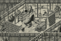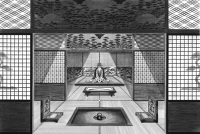Since 2015, Kyung-Me (b. 1991, lives and works in New York, NY) has been creating intricate works on paper that combine and subvert artistic traditions such as handscroll or emakimono, and Western technical drawing by emphasising the labyrinthine and psychological aspects of architectural environments. Pivoting from making drawings of parallel projection to mapping a perspective that produce mirror effects along the centre, Kyung-Me created for the exhibition “Sister” in New York in 2022 a suite of eight lavish drawings set in two distinct institutions: monastery, and geisha lodging home (okiya). The drawings feature female figures that are as solemn and paralysed as the shrouded chambers, flawlessly decorated in order to reveal the uncannily organic that disturbs and collapses.